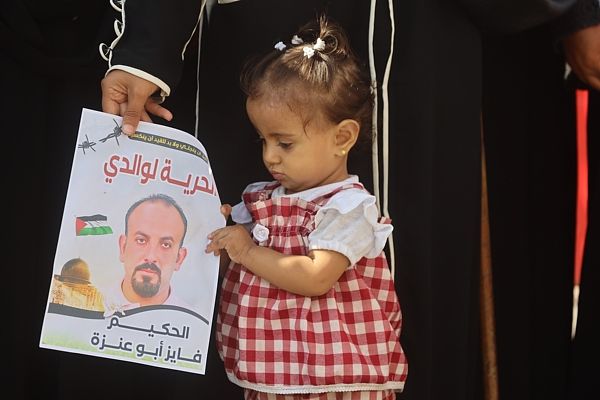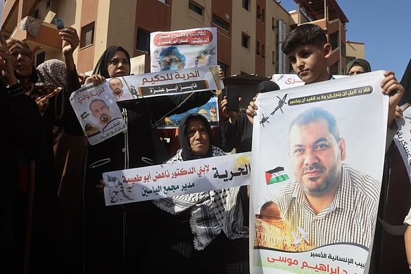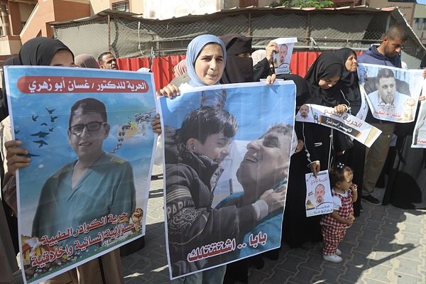 当地时间2025年10月18日,加沙地带汗尤尼斯,被以色列军队拘留的巴勒斯坦医生和医护人员的家属在纳赛尔医院前举行示威,呼吁释放仍被关押在以色列监狱中的亲人。