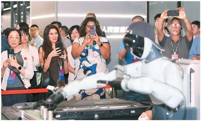 图为近日,在上海浦东新区张江科学城内的“模力社区”,参加第二届世界中国学大会“中国式现代化”主题参访活动的嘉宾参观人形机器人。