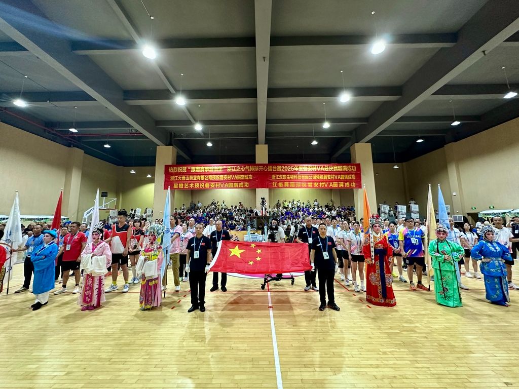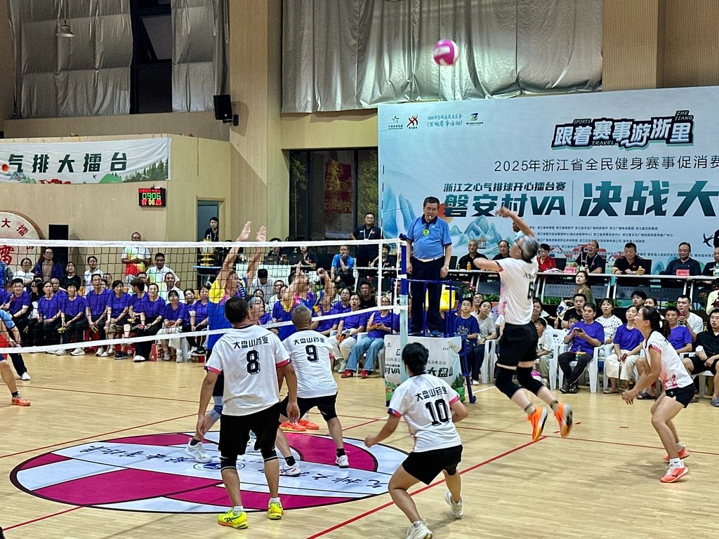 2025年10月18日晚,在浙江省金华市磐安县,2025年“跟着赛事游浙里”浙江之心气排球开心擂台赛·磐安村VA迎来年终总决赛,吸引浙江省内外气排球选手参赛。磐安是浙江中部的山区县,民间气排球氛围浓厚。受贵州榕江“村超”启发,当地连续2年举办“村VA”,已累计吸引全国十多个省份选手、教练参赛。图为总决赛现场,浙江大盘山药业队队员挑起扣杀。 中新社记者 张斌 摄
