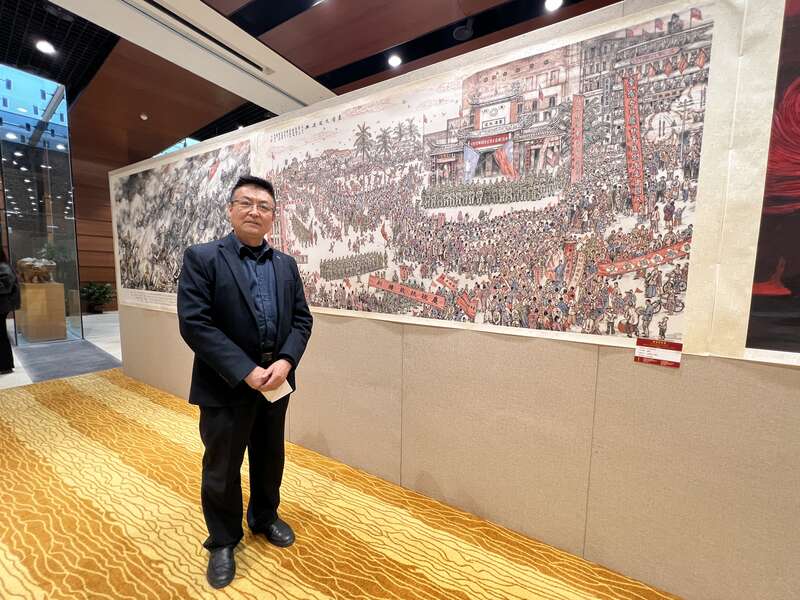 “当我们描绘抗战烽火、台湾光复等场景时,我们笔下流淌的是同一种家国情怀。两岸画家的作品共同诉说着一个朴素的真理:我们的历史是共通的,我们的根是连在一起的。”台盟中央两岸书画院常务副院长、台海出版社负责人窦为龙在接受采访时表示,本次画展展出作品的合集《丹青颂丰碑》就是这份共同情感的“实体化”。他希望以书画作品为媒介,让更多两岸同胞能够直观地感受到这种血脉相连的悸动,更加珍惜和平生活,携手向前。