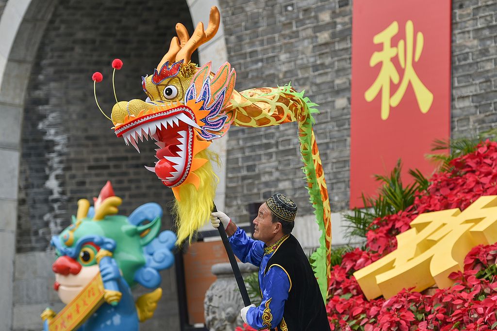 2025年10月19日,在山东省青州古城景区,民间艺人展演舞龙。