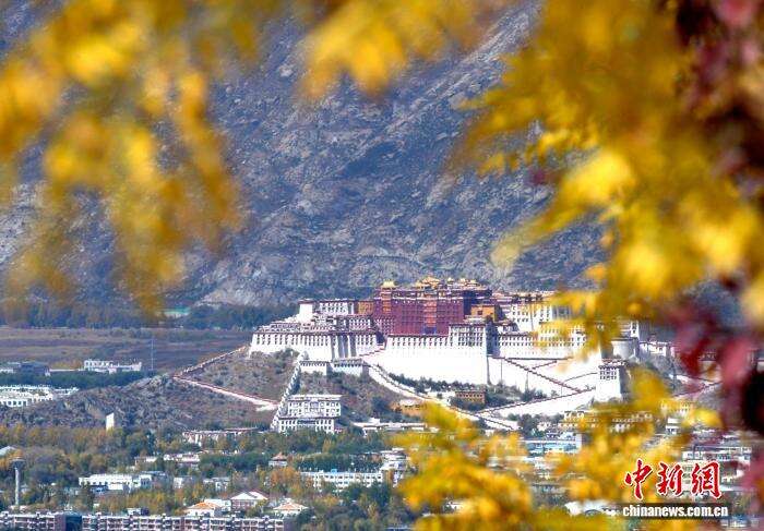 10月20日,西藏拉萨深秋如画。图为拉萨天堂草原自然风景区的黄叶与布达拉宫相映成趣。中新社记者 李林 摄