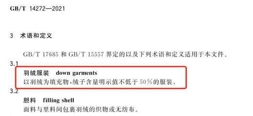 看羽绒服合格证上的执行标准是否为国标GB/T 14272-2021;