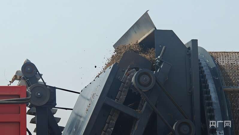 央广网图木舒克10月23日消息(记者丁安 郭璁悦)在新疆塔克拉玛干沙漠西缘的布古里沙漠深处,新疆生产建设兵团第三师图木舒克市兴安镇的5.4万亩油莎豆田正迎来丰收季。新型高效的收获机在田间穿梭,金黄的豆粒拔地而出,田边的货车将收获的油莎豆装车运往加工厂。