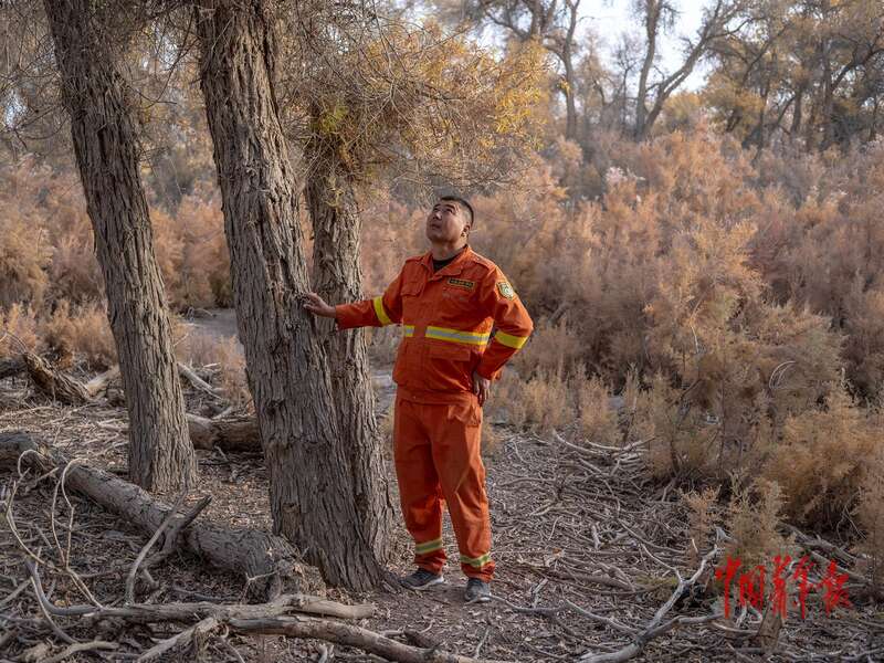 10月22日,新疆沙雅县,沙雅县胡杨林保护中心达郎唐木管护所所长依布拉依木·阿合尼亚孜,他看护这片胡杨林已经有17个年头了。中青报·中青网记者 李隽辉/摄