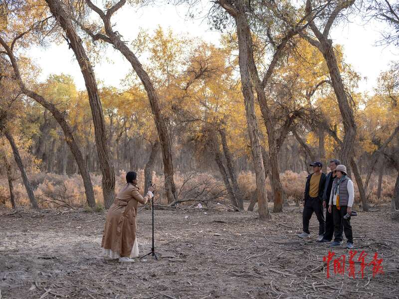 10月22日,新疆沙雅县,游客们在公路旁的胡杨林中拍照。中青报·中青网记者 李隽辉/摄