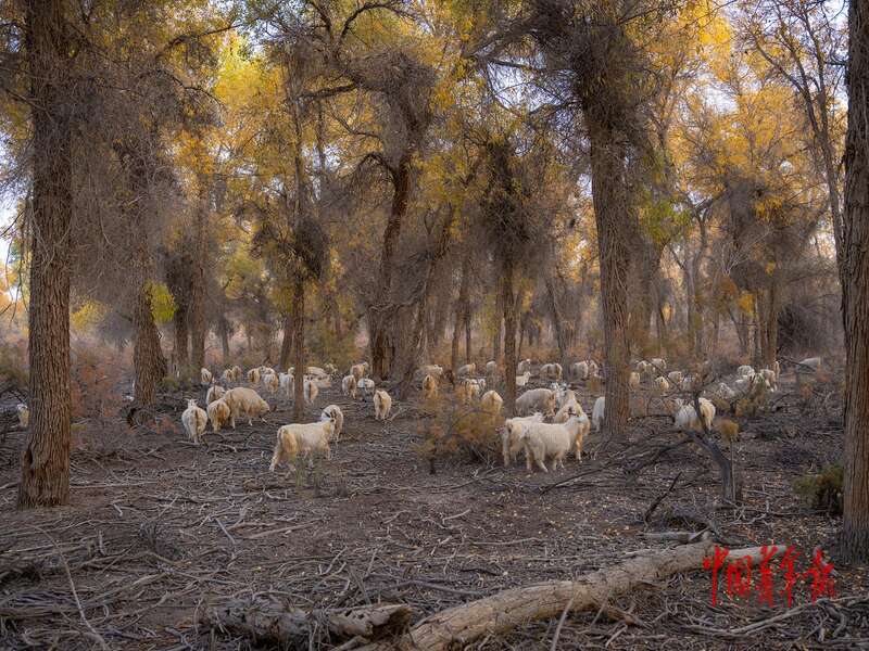 10月22日,新疆沙雅县,羊群穿过胡杨林。中青报·中青网记者 李隽辉/摄