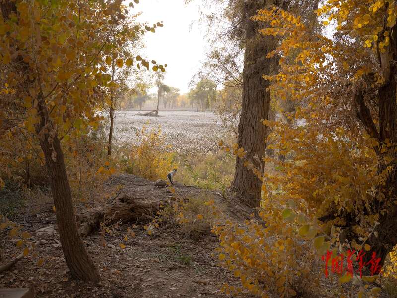 10月22日,新疆沙雅县,胡杨林一角,远处是还未收割的棉花田。中青报·中青网记者 李隽辉/摄