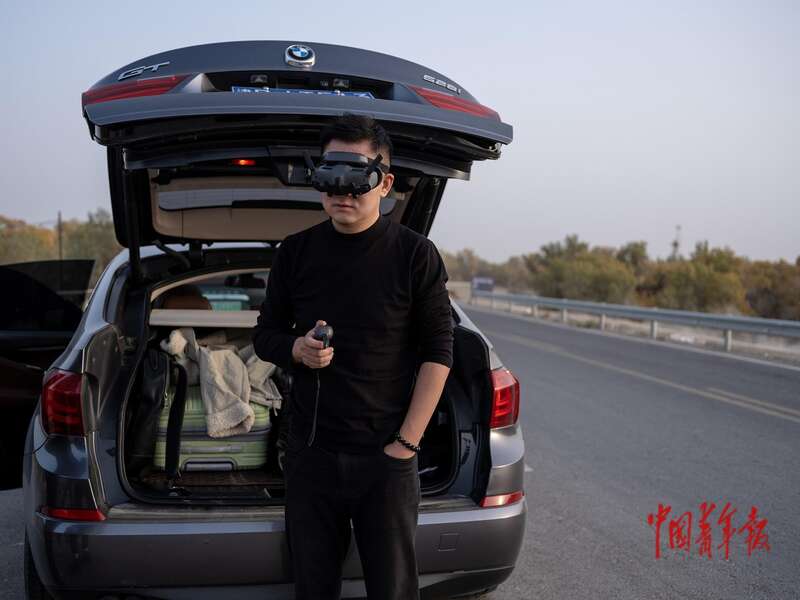 10月22日,新疆沙雅县,一名游客在塔里木河旁使用无人机拍摄。中青报·中青网记者 李隽辉/摄
