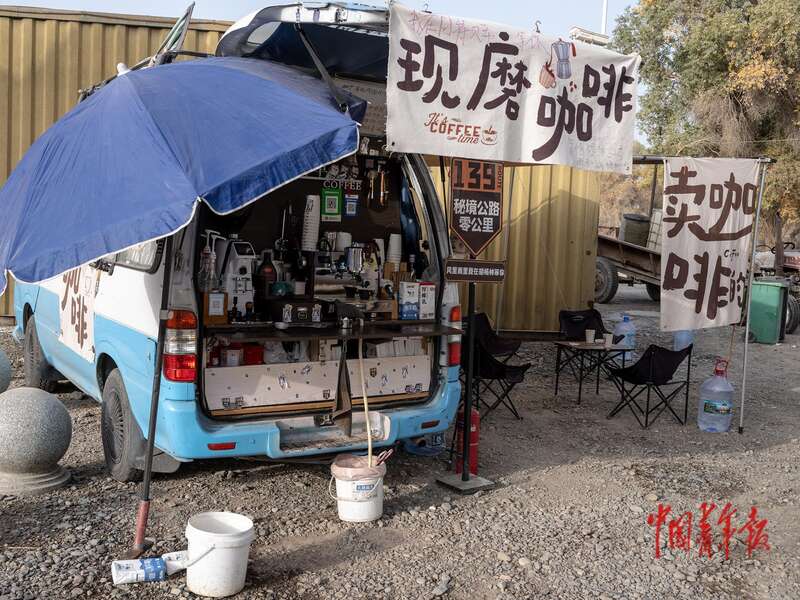 10月22日,新疆沙雅县,景区游客中心门前的咖啡车。中青报·中青网记者 李隽辉/摄
