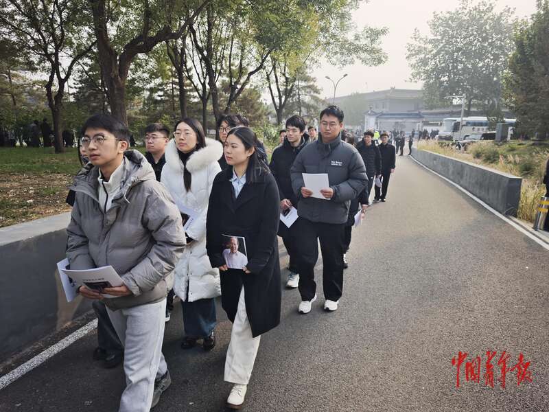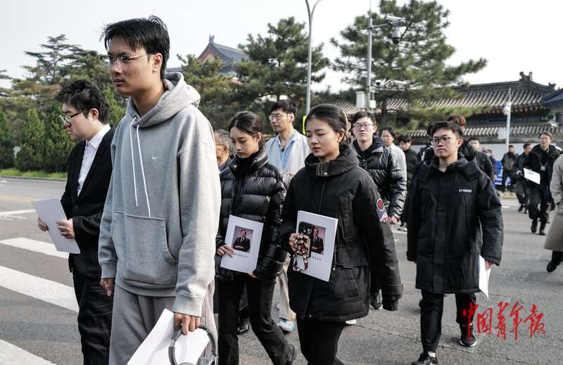 10月24日,北京八宝山殡仪馆,杨振宁遗体告别仪式结束后,前来悼念的年轻人从礼堂走出。诺贝尔物理学奖得主、中国科学院院士、著名物理学家杨振宁于10月18日在北京逝世,享年103岁。10月24日上午9时,杨振宁遗体告别仪式在北京八宝山殡仪馆大礼堂举行,许多民众前来送别。中青报·中青网记者 赵迪/摄