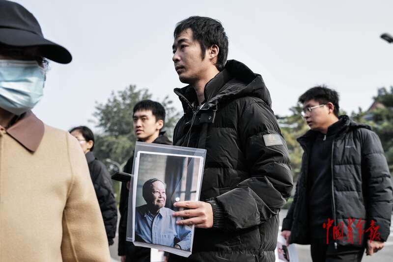 10月24日,北京八宝山殡仪馆,一名前来参加杨振宁遗体告别仪式的男子拿着杨振宁的照片。中青报·中青网记者 赵迪/摄
