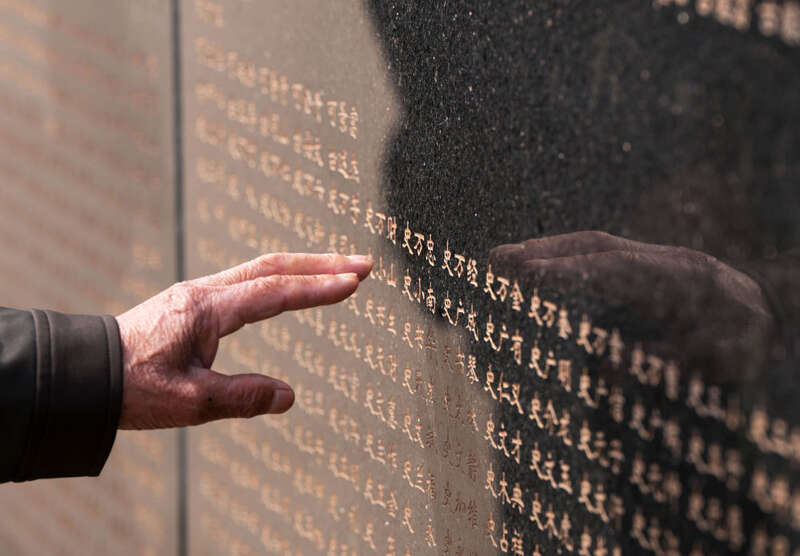 2024年4月3日,在沈阳抗美援朝烈士陵园,史荣升老人手指轻触刻有父亲名字的烈士英名墙。新华社记者 李钢 摄