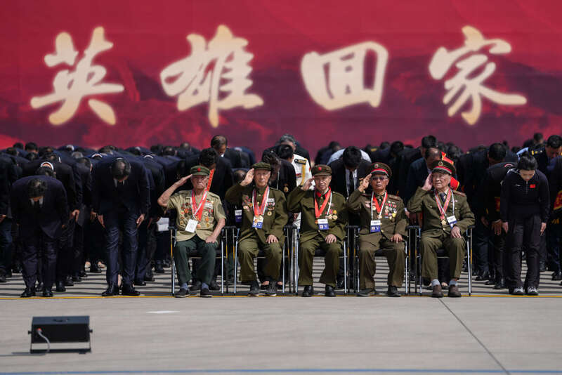 9月12日,第十二批在韩中国人民志愿军烈士遗骸回国。这是志愿军老战士在沈阳桃仙国际机场举行的迎回仪式上敬礼。新华社记者 潘昱龙 摄