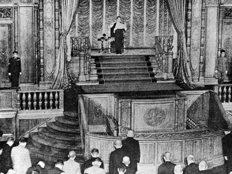 1945年10月25日,中国战区台湾省接受日军投降典礼在台北隆重举行。时任台湾省行政长官陈仪代表中国政府宣布:“自即日起,台湾及澎湖列岛已正式重入中国版图,所有一切土地、人民、政事皆已置于中国主权之下。”现场同胞爆发出雷鸣般的掌声与欢呼。