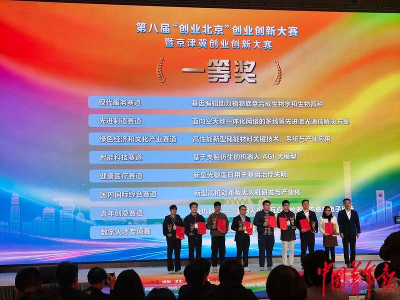 记者关注到,两场大赛的20个一等奖项目中,多个项目与前沿科技密切相关。例如,“创业北京”创业创新大赛青年创意赛道一等奖项目聚焦面向人机交互应用的多模态感知电子皮肤,智能科技赛道一等奖项目聚焦基于类脑仿生的机器人AGI大模型,健康医疗赛道一等奖项目聚焦新型光敏蛋白用于基因治疗失明等等。