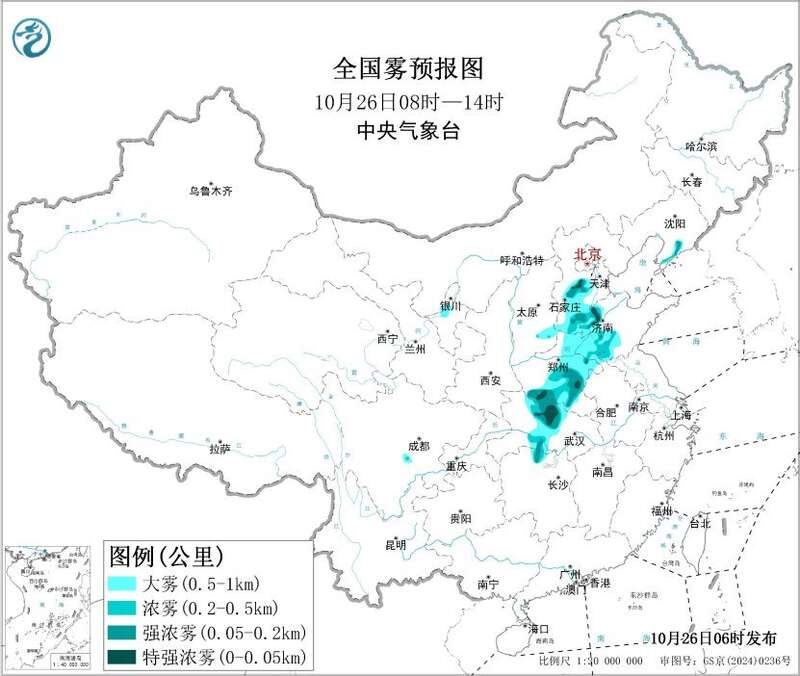 预计,10月26日早晨至上午,河北中南部、山东西部、河南中东部、湖北中部等地有大雾,其中河北南部、山东西部、河南南部、湖北北部等地的部分地区有能见度不足500米的浓雾,局地有能见度不足200米的强浓雾。