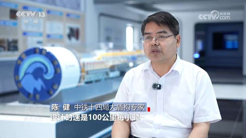 中铁十四局大盾构专家陈健:“它采用的是双向六车道,采用高速公路的设计标准,设计时速是100公里每小时,所以它比城市干道或者其他过江通道建设的标准更高,速度更快,所以隧道断面也达到了16米。隧道采用盾构法施工,它要实现一边掘进,一边要进行衬砌安装,所以隧道的开挖直径要大于16.64 米。”