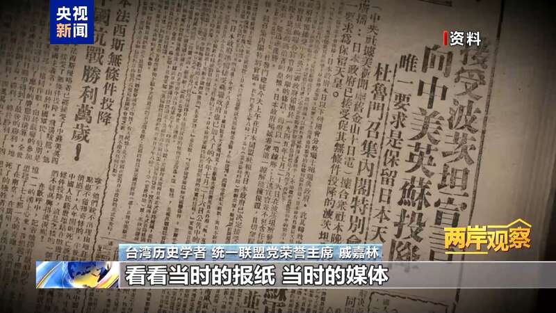 台湾历史学者、统一联盟党荣誉主席戚嘉林表示,看看当时的报纸、当时的媒体,全岛台湾民众是陷于狂欢的境地,来庆祝台湾光复,这是不可磨灭的历史。民进党不可能一手遮天,把历史磨灭。