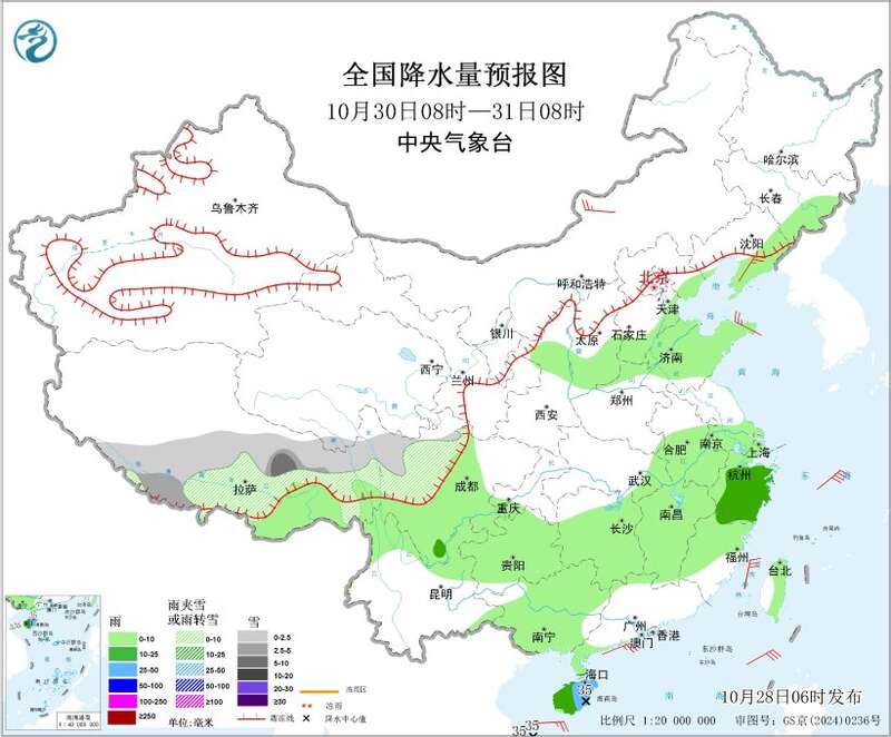 10月28日08时至29日08时,西藏西南部和中东部、青海南部、川西高原北部等地部分地区有中到大雪,局地暴雪或大暴雪(20~25毫米)。陕西南部、四川盆地东北部、海南岛东部和南部、台湾岛北部和东部等地部分地区有中到大雨,其中,海南岛东南部、台湾岛东北部等地局部地区有暴雨(50~90毫米)。内蒙古中部、黑龙江东北部、辽东半岛、西藏中部、山东半岛、海南岛等地部分地区有4~5级风;台湾海峡、台湾以东洋面、东海南部海域、巴士海峡、北部湾、琼州海峡、南海北部和中西部海域将有5~7级风、阵风8~9级。