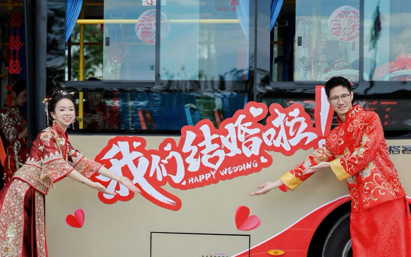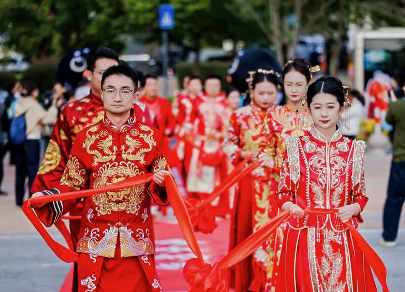 典礼伊始,可爱的吉祥物“湖包包”手捧传统竹箩筐,在主入口喜迎新人和宾客,并向沿途群众分发彩果与喜糖,将美好寓意传递给大家。