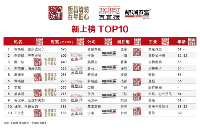 新人之首是老铺黄金的徐高明、徐东波父子,以695亿元财富跻身前100;其次是集换式卡牌龙头卡游的李奇斌、齐燕夫妇,财富600亿元。新人前十还包括智能影像设备企业影石34岁的刘靖康与其妻子潘瑶,财富385亿元。此外,“奶茶”界知名品牌古茗、霸王茶姬和沪上阿姨成功上市,创始人39岁的王云安、30岁的张俊杰和47岁的单卫钧与其妻子周蓉蓉分别以185亿元、135亿元和95亿元财富首次上榜。