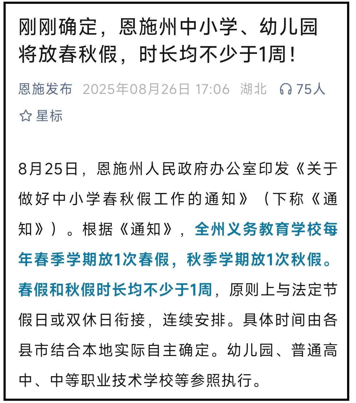 今年8月,湖北恩施州印发“中小学春秋假通知”
