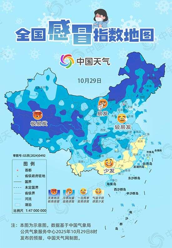 10月30日起,受冷空气影响,北方多地将迎明显降温,南方降水增多气温也将走低,易感冒区域有所扩大。不仅华北北部、西北地区、东北地区大部等地易引发感冒,江苏、上海、浙江的部分地区和湖南等地也将加入容易感冒的行列。长沙今天最高气温将降至17℃,再加上有雨水相伴,湿凉明显,易引发感冒。