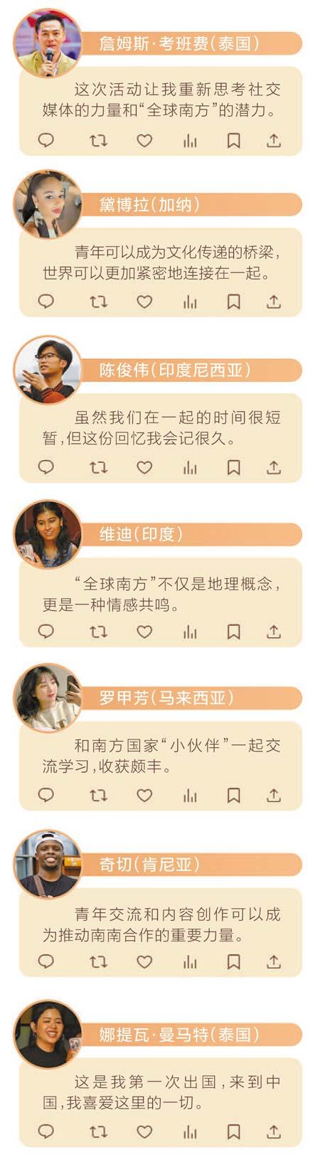 几天时间里,研修营成员与中国网红一同跳起热度爆棚的《大展鸿图》舞蹈,与中国青年代表交流青年发展与社会治理。在一幕幕真切的互动中,他们感受到中国社会的蓬勃活力,也体会到人与人之间的温情与善意。镜头闪动之间,他们记录下的不只是影像,更是一个立体、生动的南方国家新生力量的群像。