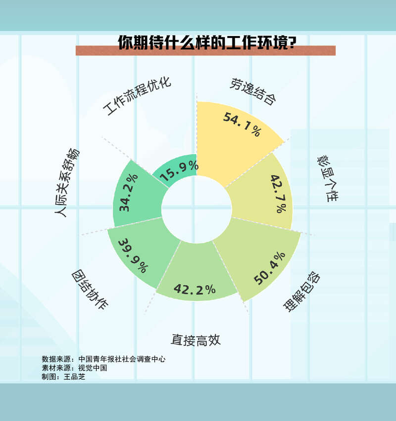 调查中,大家还期待劳逸结合的工作节奏(54.1%)、理解包容的工作环境(50.4%),其他还有:彰显个性(42.7%)、直接高效(42.2%)、团结协作(39.9%)、人际关系舒畅(34.2%)、工作流程优化(15.9%)等。