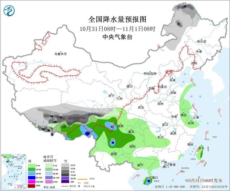 10月31日08时至11月1日08时,西藏中东部和西南部、川西高原北部、黑龙江西北部、内蒙古东北部等地部分地区有大到暴雪,其中,西藏中部局地有大暴雪,西藏西南部局地有大暴雪或特大暴雪(30~35毫米)。西藏南部和东部、四川中西部和南部、云南东北部、贵州西北部、海南岛、台湾岛等地部分地区有中到大雨,其中,西藏东南部、四川南部、海南岛中部等地局地有暴雨(50~80毫米)。内蒙古东北部和中部、辽东半岛、川西高原北部等地部分地区有5~7级风;东海海域、台湾海峡将有5~7级、阵风8级的风,将有5~7级、阵风8级的风。