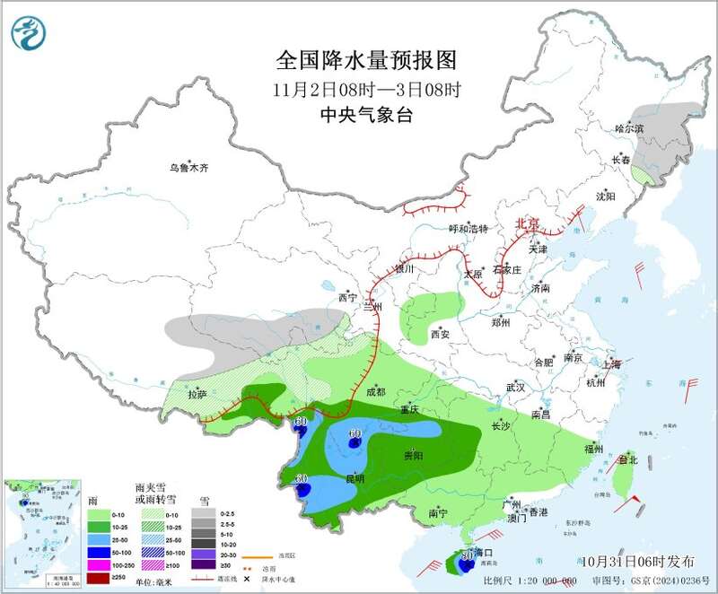 11月1日08时至2日08时,内蒙古东北部、黑龙江中西部和南部、吉林、西藏东北部和南部、青海南部、川西高原北部等地部分地区有小到中雪或雨夹雪,其中,黑龙江西部等地局地有大雪(5~8毫米)。西藏南部和东部、四川中西部和南部、贵州北部、云南北部和西南部等地部分地区有中到大雨,其中,西藏东南部、云南西北部等地部分地区有暴雨(50~60毫米)。内蒙古中东部、黑龙江西北部、川西高原北部等地部分地区有4~6级风,新疆北部部分地区有6~7级风;渤海、渤海海峡、黄海北部和中部海域、台湾海峡、巴士海峡、南海东北部海域将有5~7级、阵风8级的风。