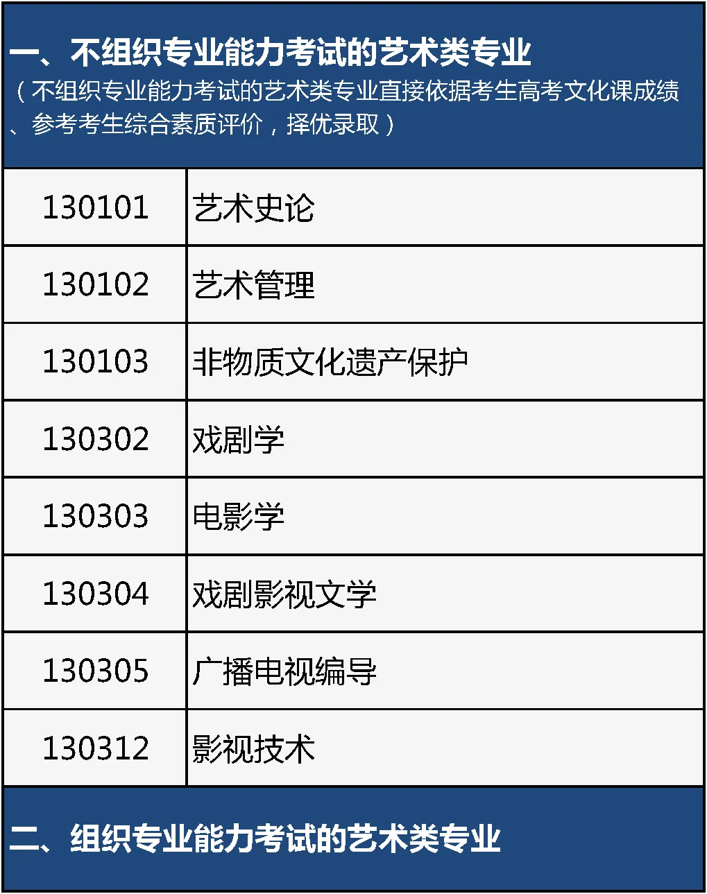 1.教育部《普通高校艺术类考试招生本科专业目录》中艺术史论、艺术管理、非物质文化遗产保护、戏剧学、电影学、戏剧影视文学、广播电视编导、影视技术8个专业和《北京市高等职业教育艺术类考试招生本科和专科专业目录》中数字广播电视技术、影视编导等16个专业,不再进行艺术类专业能力考试,直接依据考生高考文化课成绩,参考考生综合素质评价,择优录取考生。