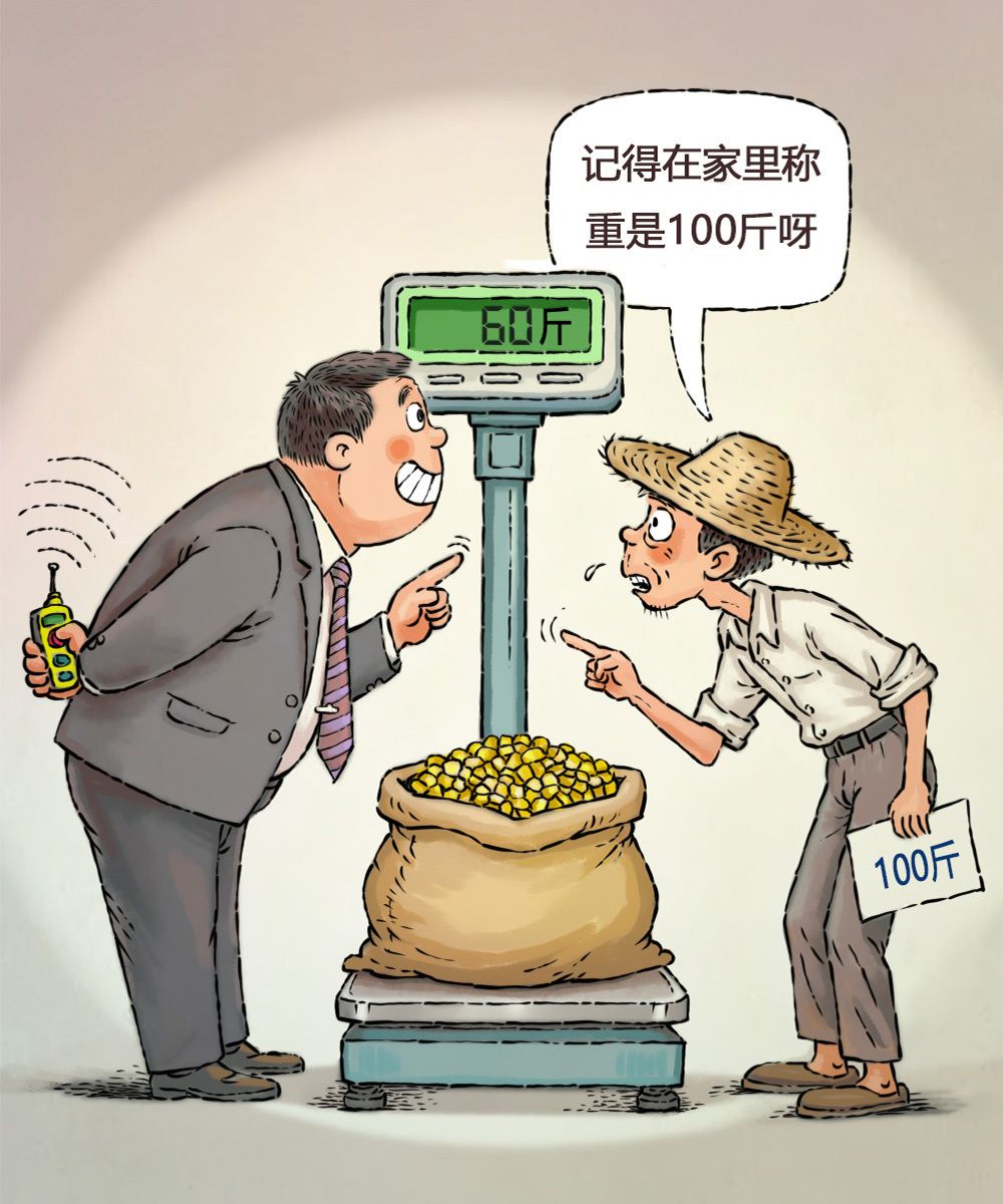 明明100斤的玉米,经嫌疑人一番操作后,秤上显示的仅为60斤,如此欺骗农民辛辛苦苦种粮得来的血汗钱,太让人气愤了。