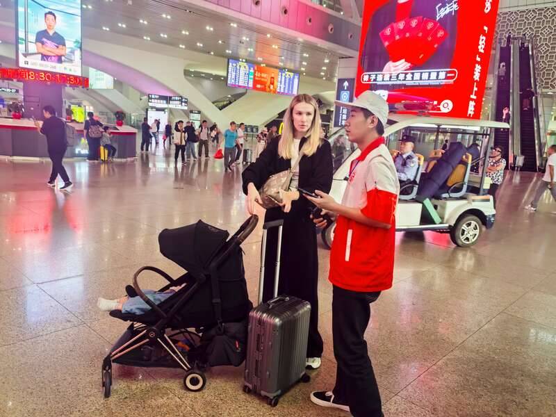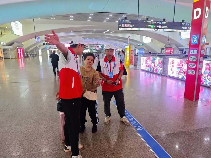 在广州南站人来人往的喧嚣中,一抹抹亮丽的“志愿色彩”格外引人注目。日前,来自中铁三局广东公司的10名“小海豚”青年志愿者,身着统一的志愿者服装,精神饱满,成为人流中可靠而醒目的“活地图”和“咨询台”。用热情的微笑、专业的服务、温暖的行动,为这座即将迎来体育盛会的城市,增添了动人的暖色。图为志愿者在为外国旅客指路。黄颖华/摄