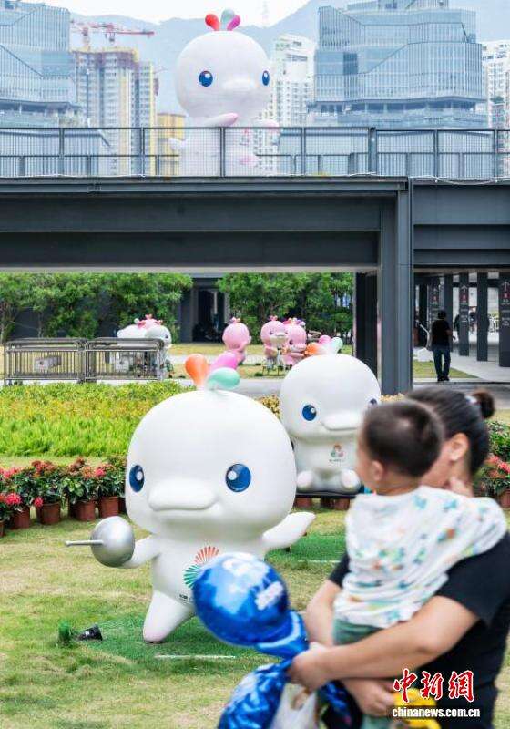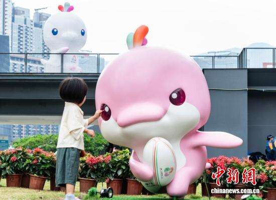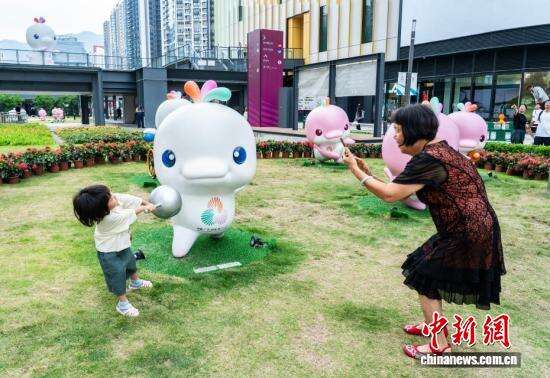 11月1日,香港新晋地标启德体育园的体育大道沿途遍布第十五届全国运动会(简称“十五运会”)装饰宣传元素,众多欢萌的吉祥物“喜洋洋”“乐融融”雕塑将园区妆点一新,静待本届全运会于11月9日正式开幕。这是香港特区首次参与承办全国运动会,有8个竞赛项目和一个群众赛事活动在香港赛区举办。图为一名小女孩在吉祥物“乐融融”雕塑旁玩耍。