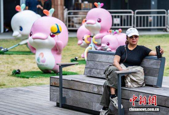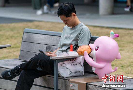 一尊吉祥物“乐融融”的雕塑和休憩的市民相映成趣。