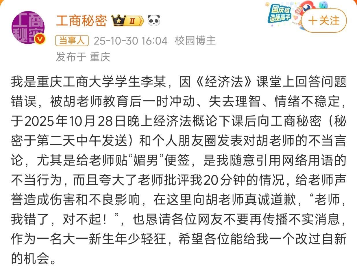 随后,涉事学生现身并道歉,称自己因在《经济法》课堂上回答问题错误,被胡老师批评后一时冲动、失去理智、情绪不稳定,于是在网上发表了对胡老师的不当言论,并夸大相关情况。该校党委宣传部工作人员称,学校老师已经知道此事,目前正在处理当中。