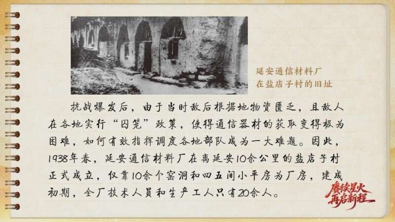 抗战爆发后,由于当时敌后根据地物资匮乏,且敌人在各地实行“囚笼”政策,使得通信器材的获取变得极为困难,如何有效指挥调度各地部队成为一大难题。因此,1938年春,延安通信材料厂在离延安10余公里的盐店子村正式成立,仅靠10余个窑洞和四五间小平房为厂房,建成初期,全厂技术人员和生产工人只有20余人。