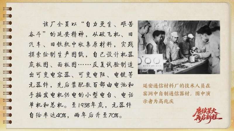 该厂全员以“自力更生、艰苦奋斗”的延安精神,从破飞机、旧汽车、旧铁轨中收集原材料,实践摸索绘制生产图纸,自己设计机器底板图、面板图……反复试验制造出可变电容器、可变电阻、电键等元器件,先后装配数百部由电池和手摇发电机供电的小型电台、电话单机和总机。至1938年底,元器件自给率达40%,两年后升至70%。