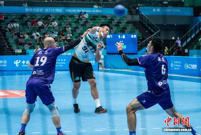 图为澳门队(白衣)和北京队(紫衣)拼抢球权。中新网记者 侯宇 摄