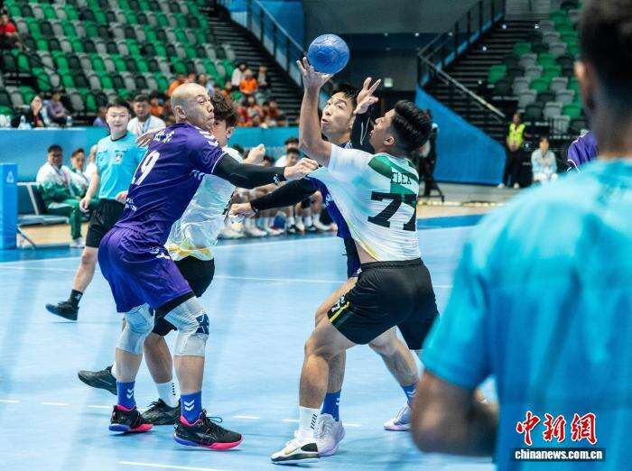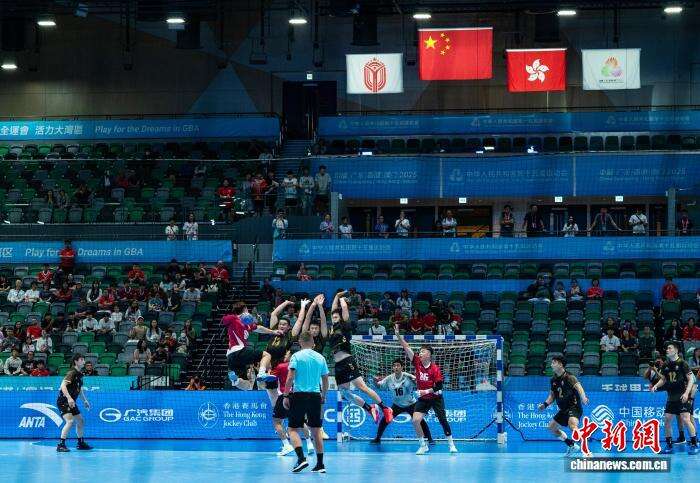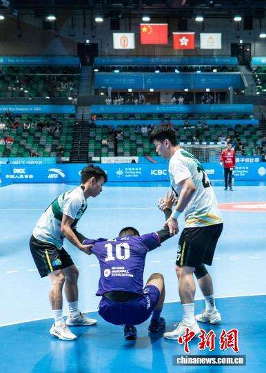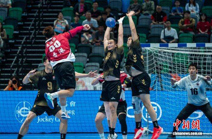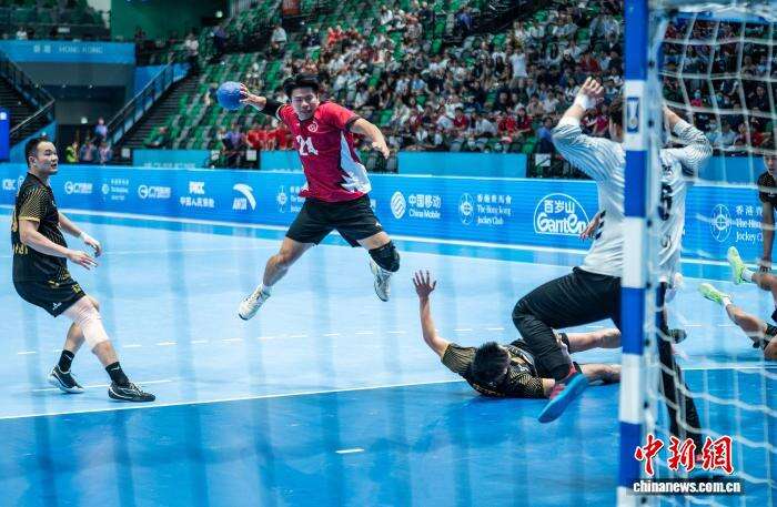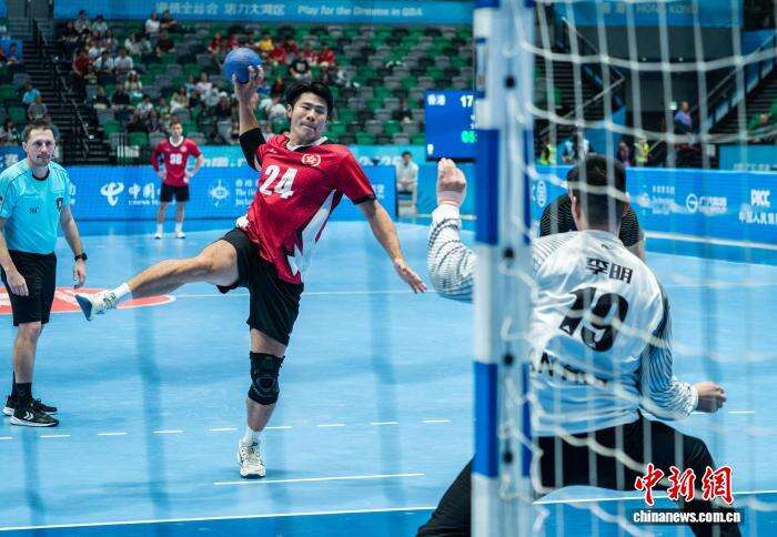 11月1日,第十五届全国运动会手球(男子组)赛事在香港赛区启德体艺馆开赛。在预赛A组的比赛中,澳门队和香港队先后亮相。最终,澳门队15:40不敌北京队,香港队经过鏖战29:34不敌安徽队。图为香港队选手(红衣)在与安徽队的比赛中进攻。中新网记者 侯宇 摄