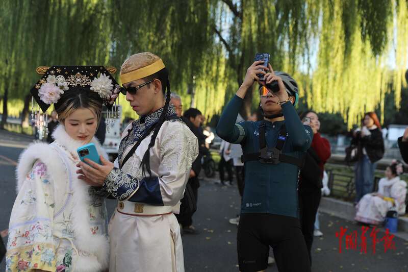 11月1日,北京故宫西南角楼下,两位身穿古装的游客正在翻看手机里刚拍的照片。中青报·中青网记者 陈剑/摄