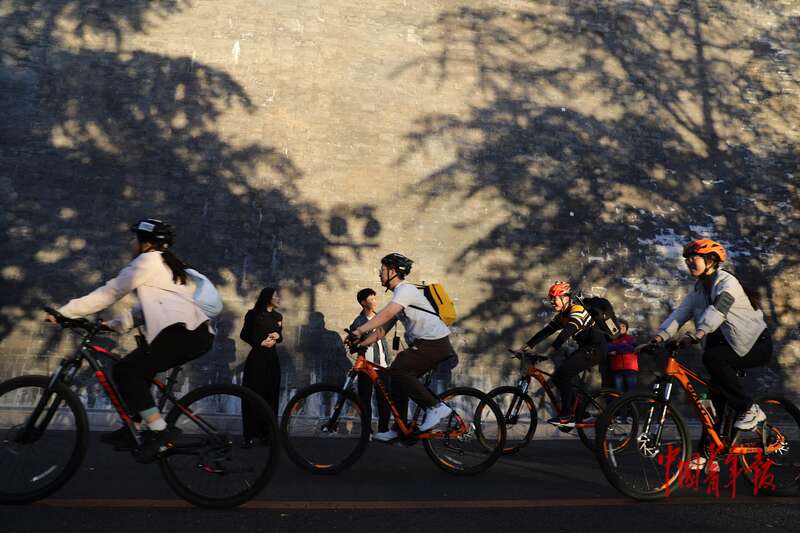 11月1日,北京故宫西南角楼下,年轻人骑车从城墙边经过。中青报·中青网记者 陈剑/摄