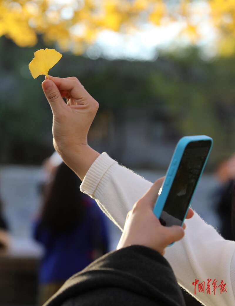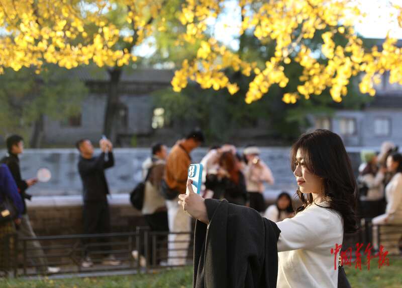 11月1日,北京故宫西南角楼下筒子河畔,一位游客用手机拍摄金黄的银杏叶。中青报·中青网记者 陈剑/摄