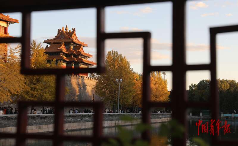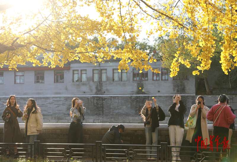 11月1日,北京故宫西南角楼下筒子河畔,游客正在金黄的银杏叶前拍照。中青报·中青网记者 陈剑/摄