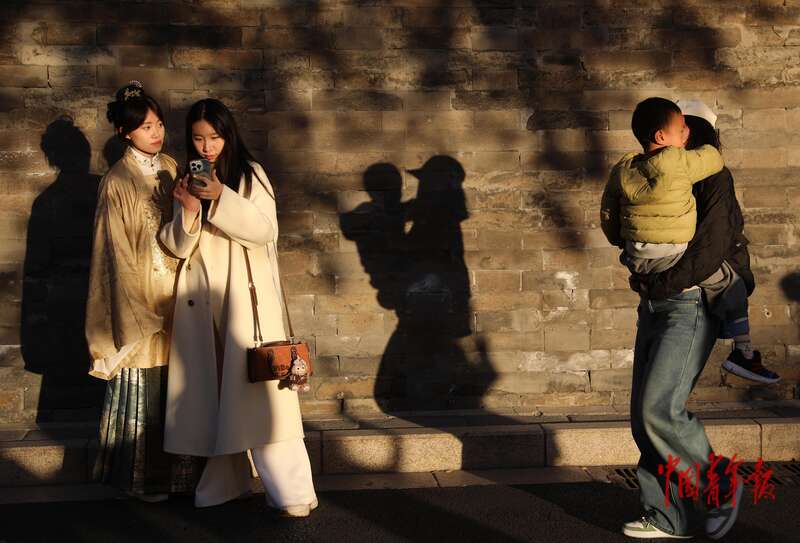 11月1日,北京故宫西南角楼下,两位游客正在翻看手机里刚拍的照片,一位母亲抱着孩子从旁边经过。中青报·中青网记者 陈剑/摄