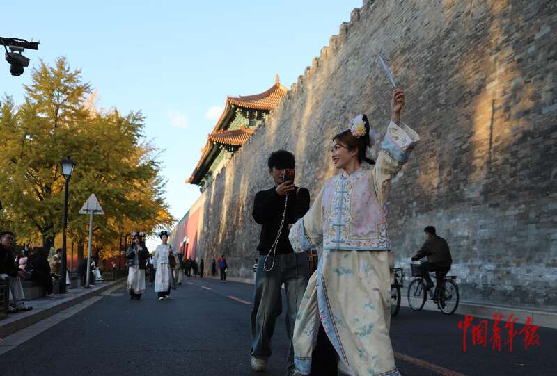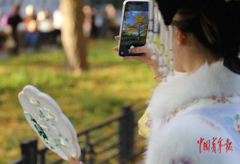 11月1日,北京故宫西南角楼下,一名身穿古装的女孩拿着糖葫芦准备拍照。时值深秋,故宫西南角楼下筒子河畔的几株银杏树树叶变黄,古韵与秋景交融,吸引众多游客特别是年轻人前来拍照打卡。据介绍,故宫的银杏树栽种始于明朝永乐年间,其中树龄最大的一棵,有近600年。有园林专家表示:古人对银杏的栽种,并非仅限于其观赏价值。他们更珍视银杏作为“活化石”的特殊地位,因为它与故宫一样,都是中华文明历史的重要见证。近年来,随着社交媒体的普及,每年10月下旬至11月初,故宫的银杏在社交网络上都处于高热度。中青报·中青网记者 陈剑/摄