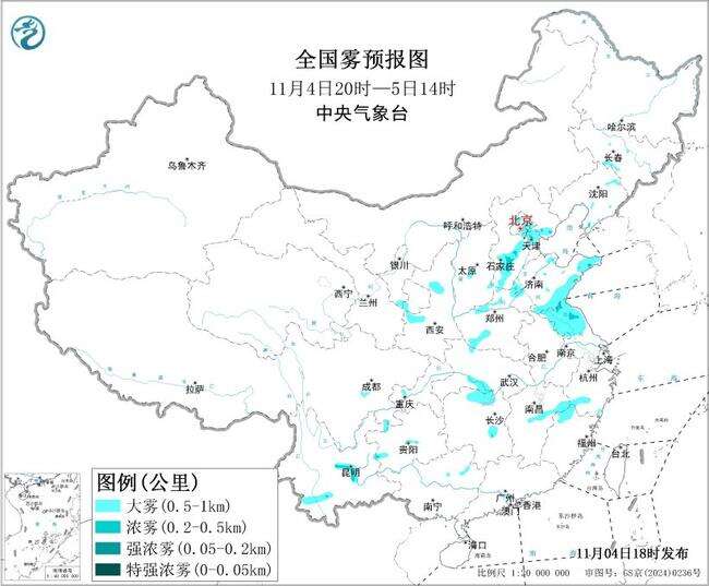 预计,11月4日夜间至5日上午,北京大部、天津、河北中南部、河南北部、山东北部和东部、江苏中北部、湖南北部、江西中部、浙江西南部、福建西北部、云南中部等地的部分地区有大雾,局地有能见度不足500米的浓雾。