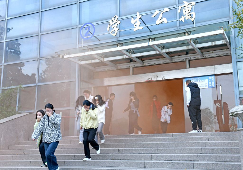 2025年11月4日,安徽淮南,淮南职业技术学院学生进行火灾疏散逃生演练。